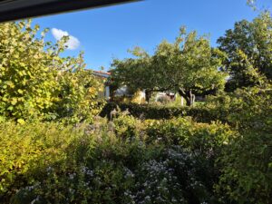 2. Till höger om mig ser jag ut genom fönstret på en klarblå himmel, gröna träd där löven börjat skifta i gult och röda bär på ett av träden.